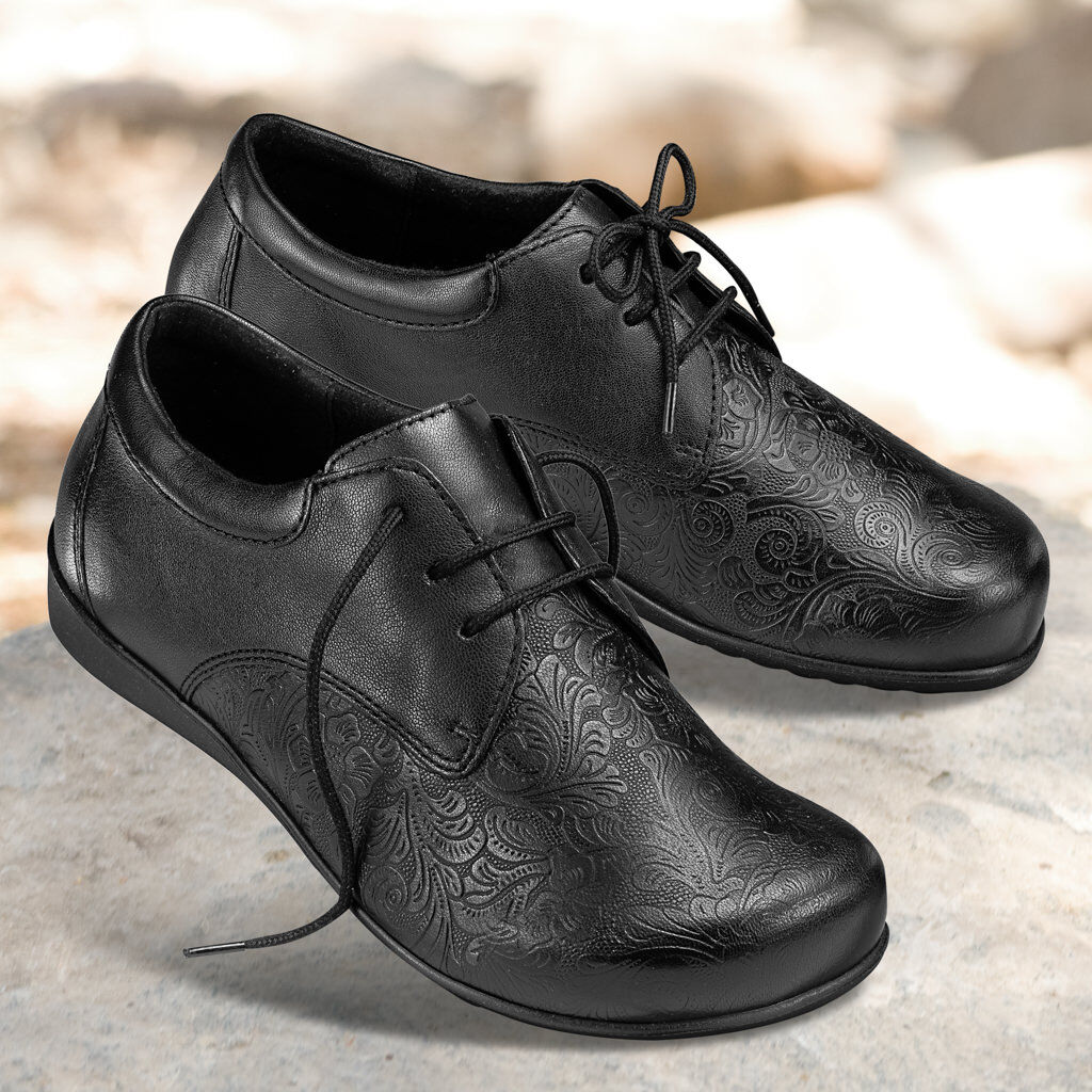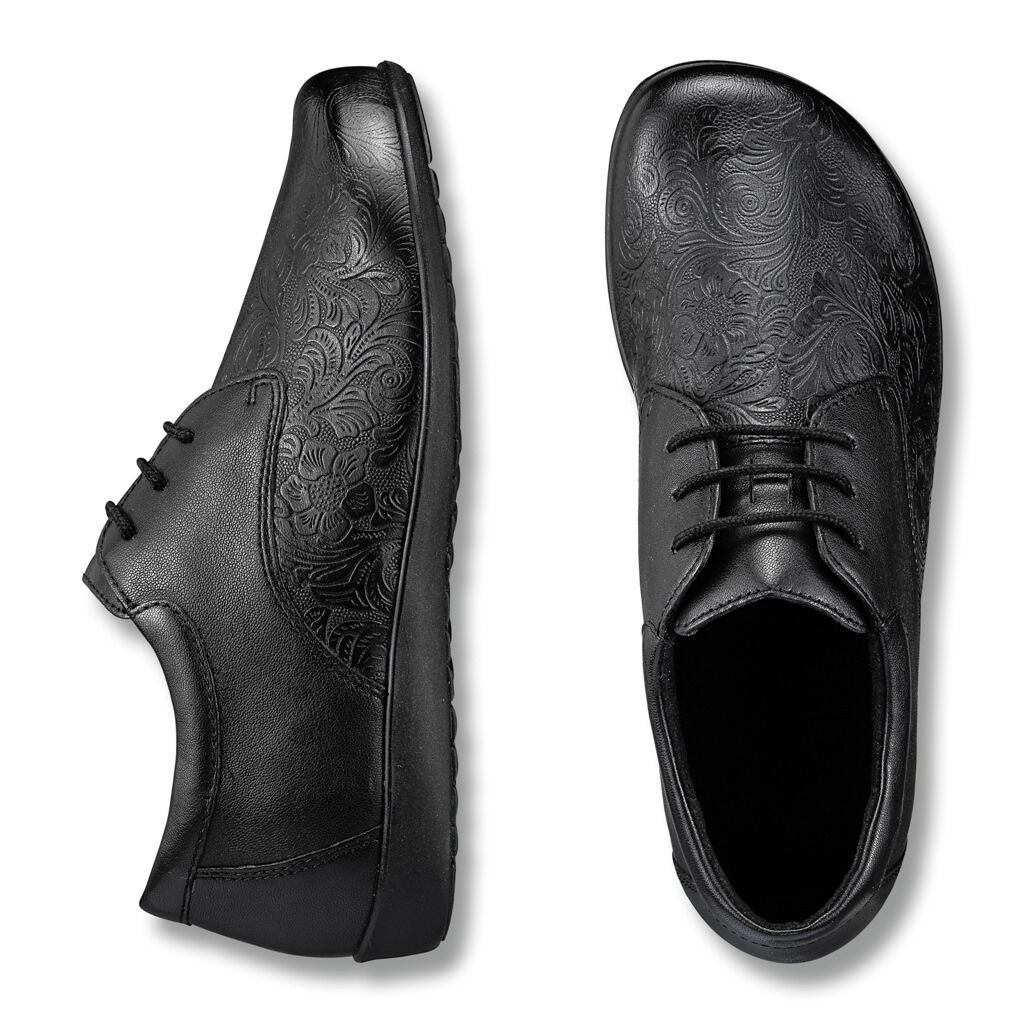 Polobotky z jemné jehněčí usně s decentní květinovou ražbou a klasickým derby šněrováním pro optimální stabilitu na noze. Zateplené hřejivou lodenovou podšívkou. S vyměnitelnou stélkou. Femininní, extra měkká podrážka s polstrovanou oblastí bříšek prstů a protiskluzovým profilem.