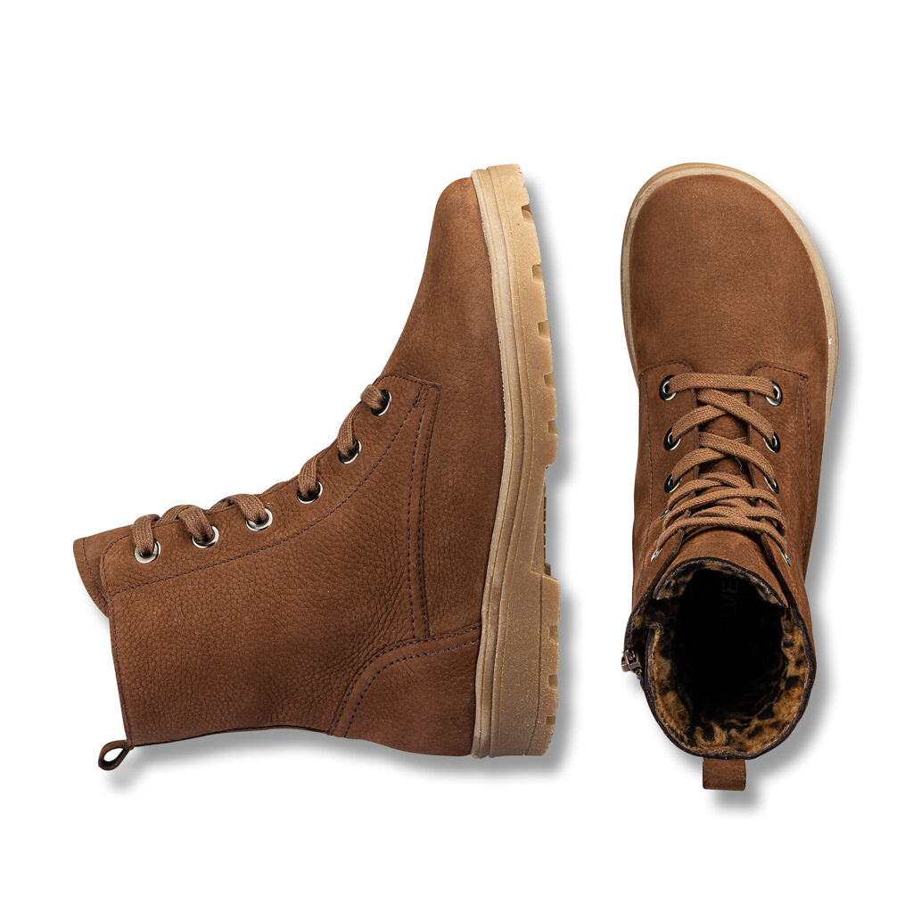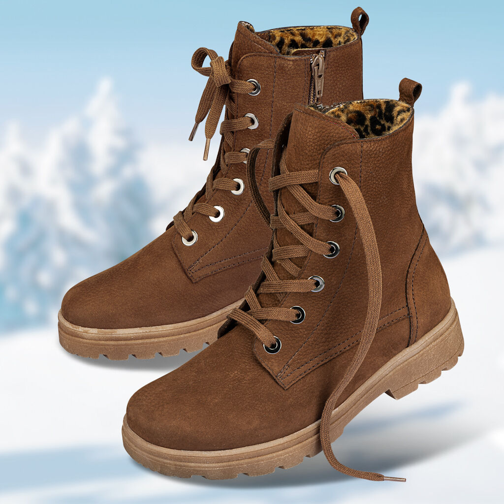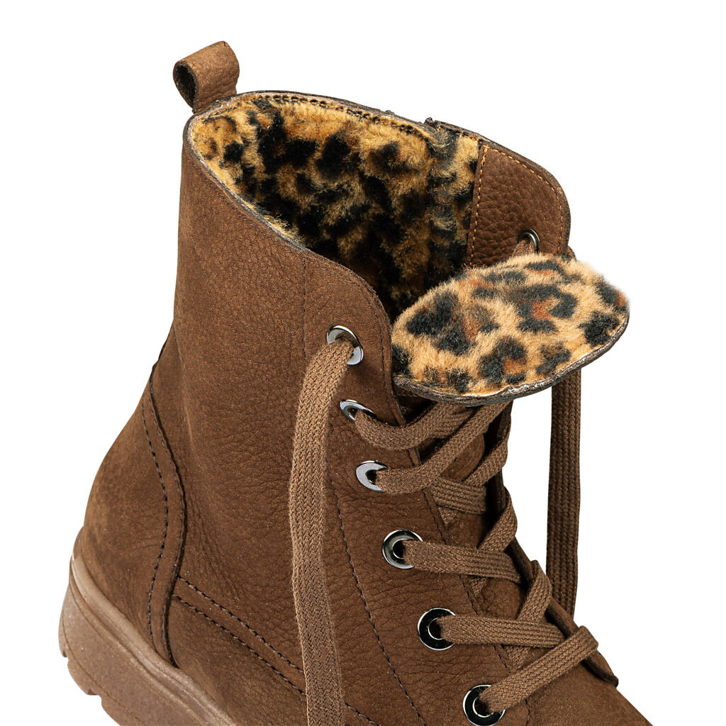 Dejte sbohem prokřehlým nohám! Trendová kožená kotníková obuv s útulně hřejivou podšívkou z beránčí kožešiny s leopardím vzorem jako nepřehlédnutelným módním detailem. Dekorativní šněrování na očka pro individuálně nastavitelný tvar. Zip na vnitřní straně pro snadné obouvání. Podrážky s přilnavým hrubým dezénem a vyměnitelnou zateplenou stélkou.