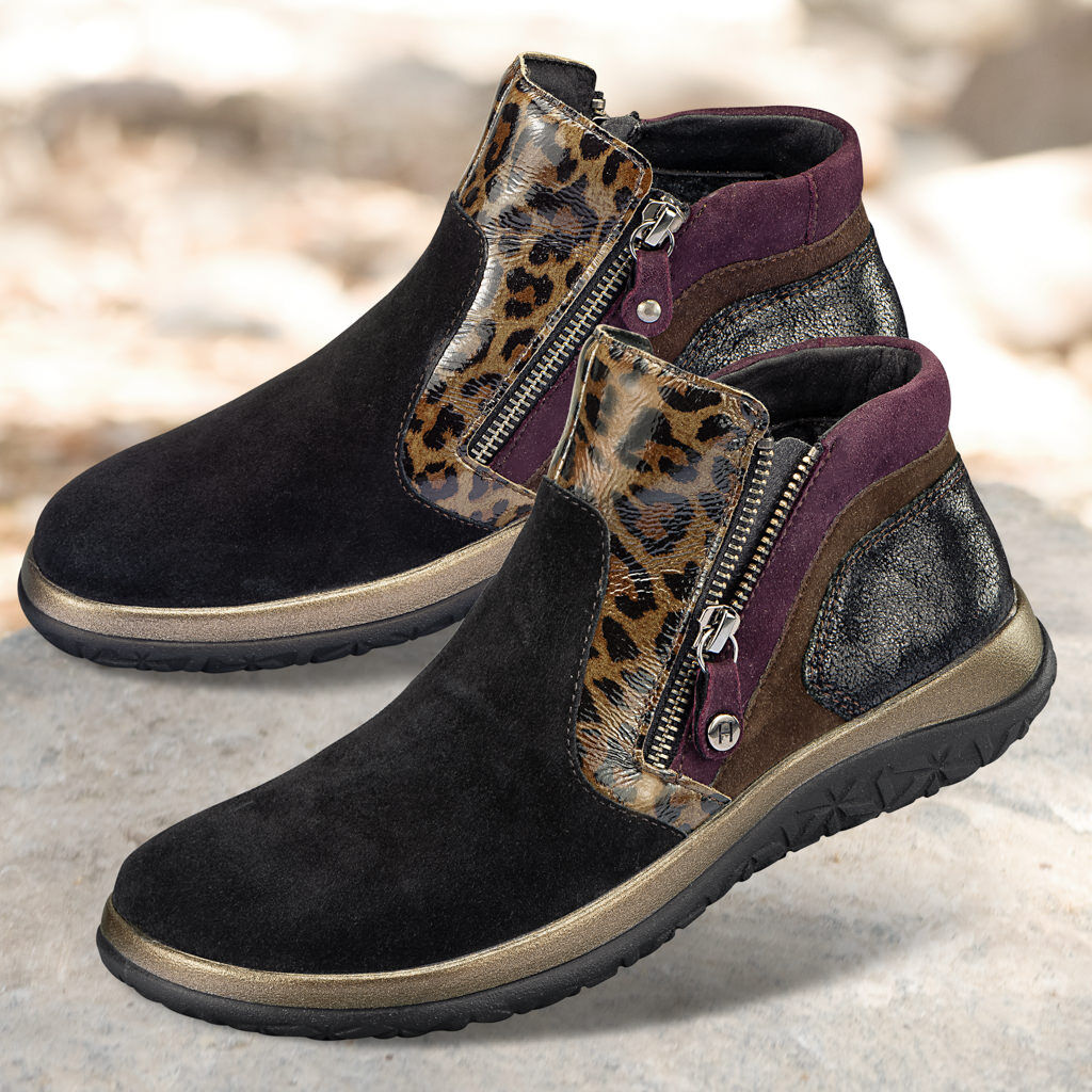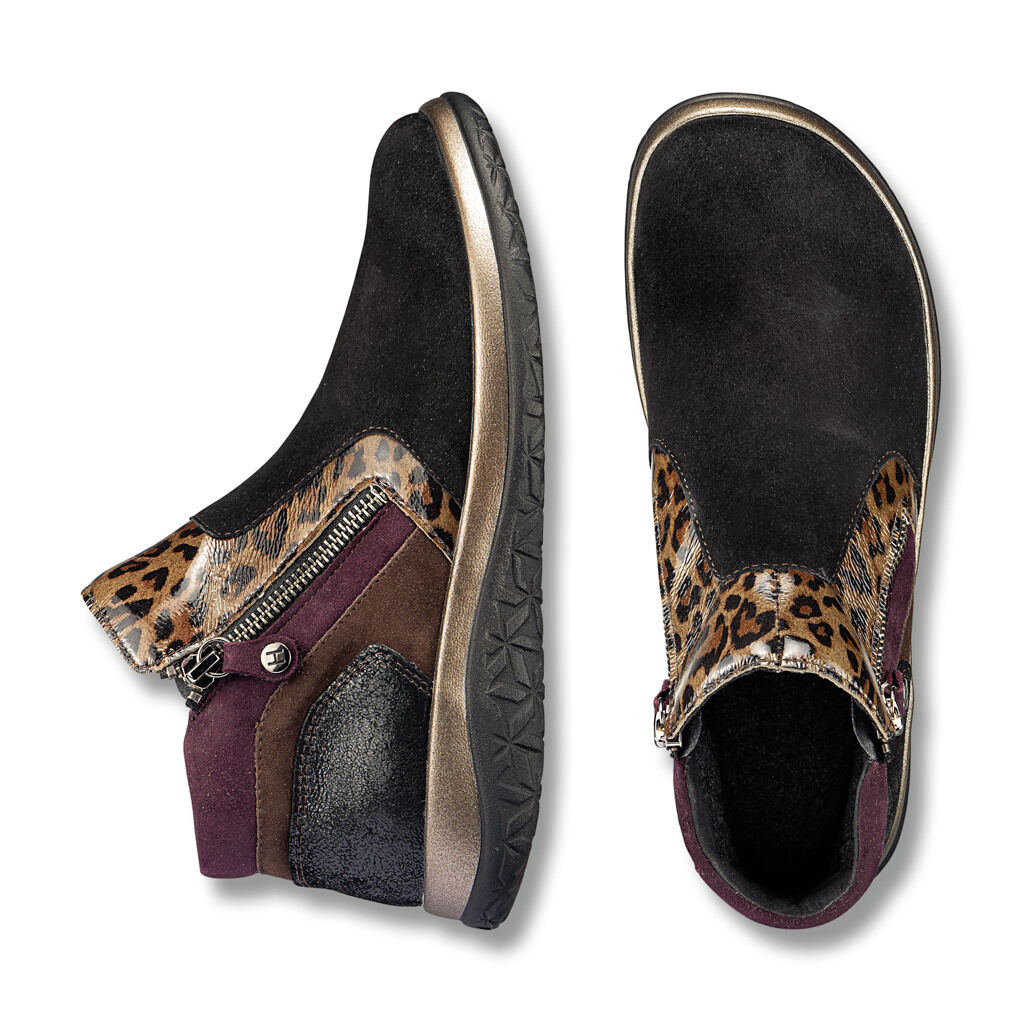 Luxusní kotníková obuv šitá speciálním poddajným stehem. Kombinace měkké kozí usně napa, nubukové a lakované usně se stylovým leopardím vzorem v podzimních tónech, se dvěma postranními zipy pro snadné obouvání. Bezešvá oblast prstů. Podšívka z přírodního vlněného lodenu. Lehká a přilnavá podrážka Comfort Motion s vyměnitelnou stélkou.