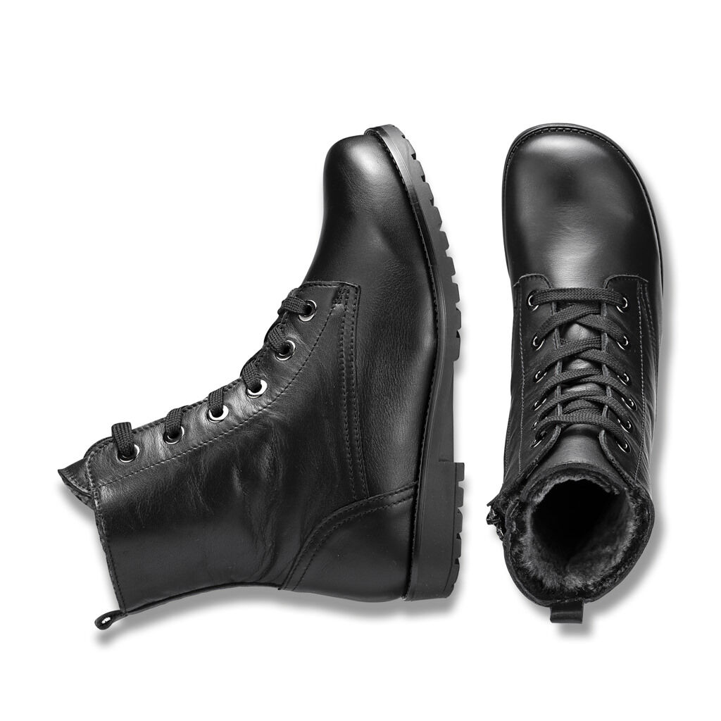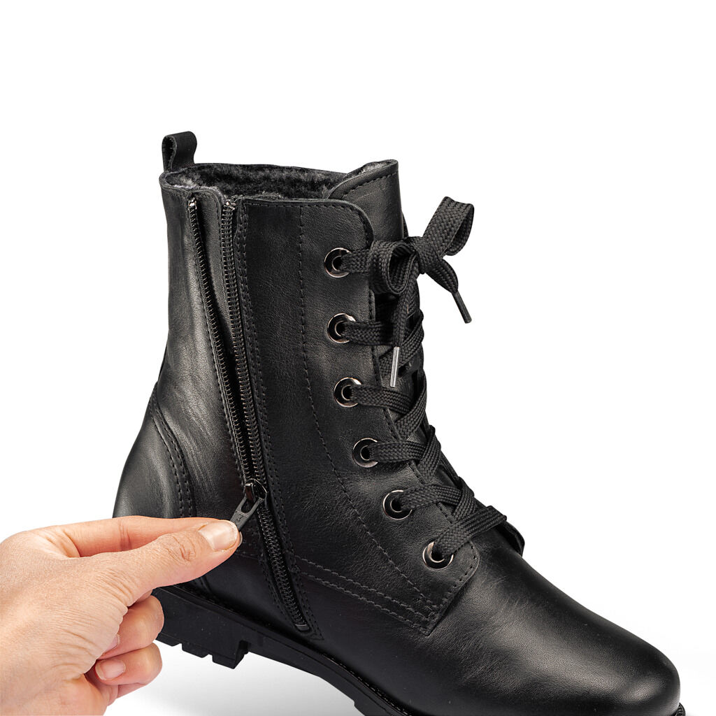 Vysoce kvalitní, elegantní kotníčková obuv z měkké hovězí usně napa v derby střihu, s útulně hřejivou beránčí kožešinou pro přirozené teplo bez pocení. S dekorativním šněrováním na očka pro individuální tvar a praktickým zipem na vnitřní straně pro snadné nazouvání. Módní rámová podrážka prošitá po celém obvodu, s klasickým mírným podpatkem a hřejivou vyjímatelnou stélkou.