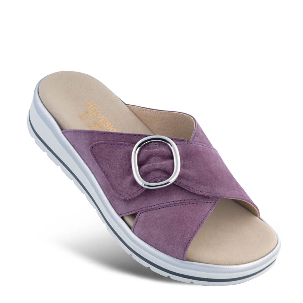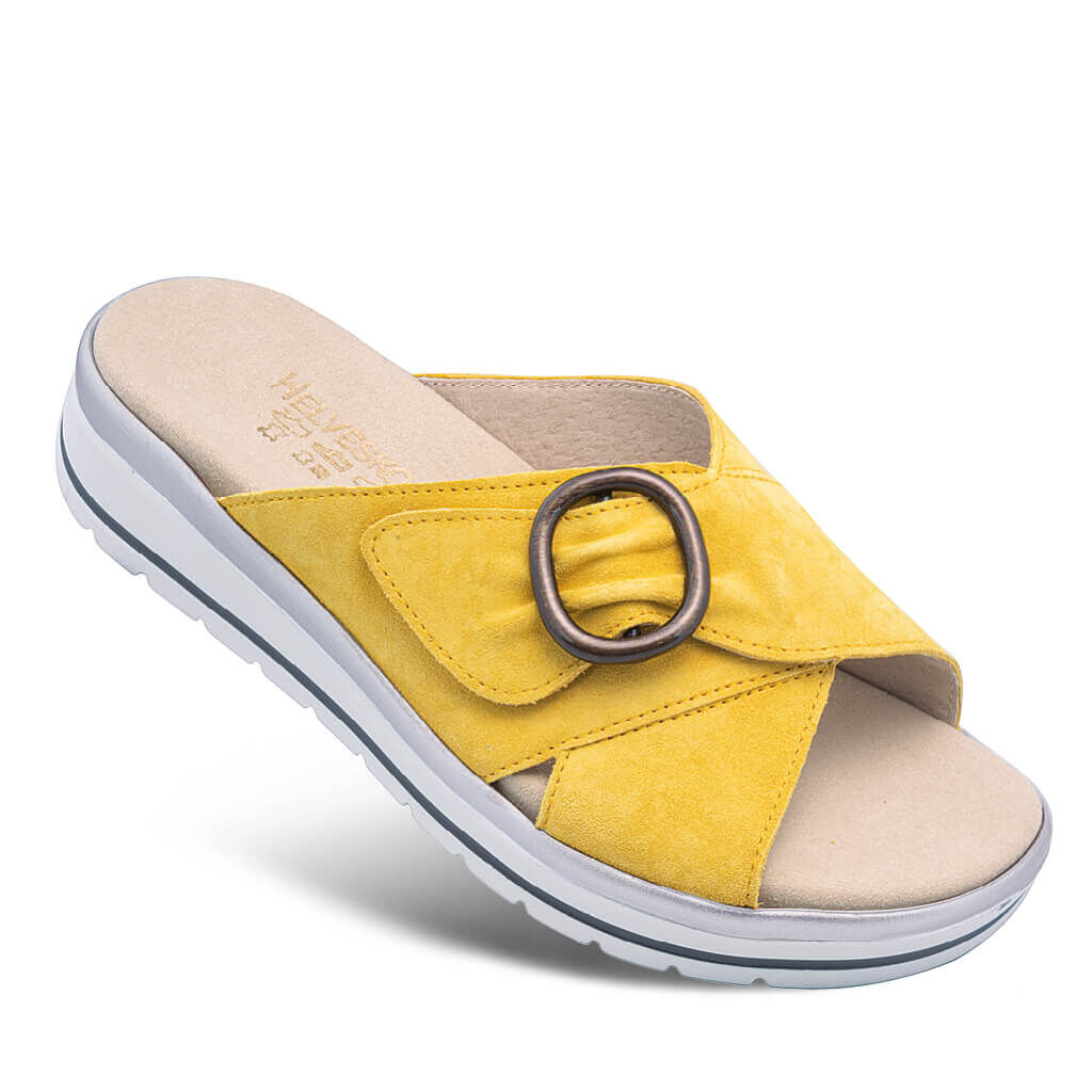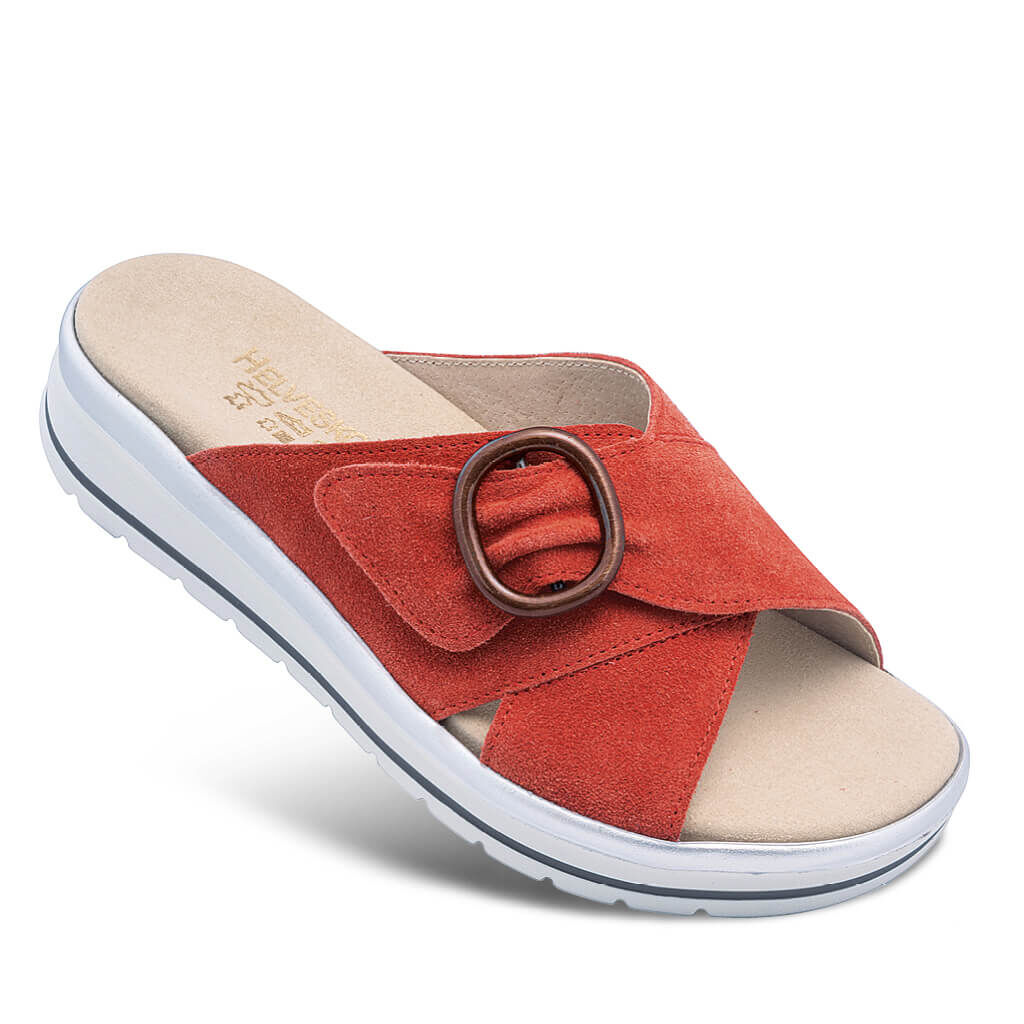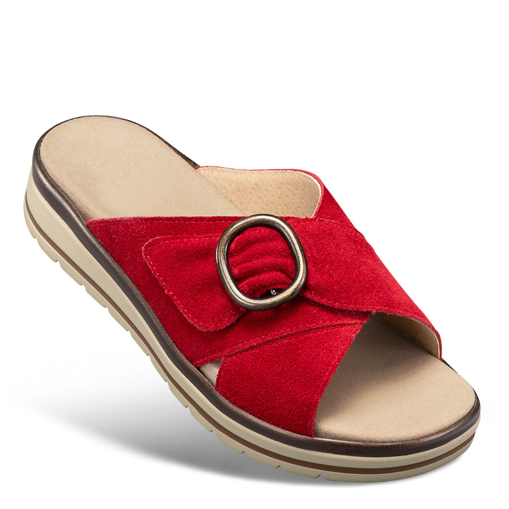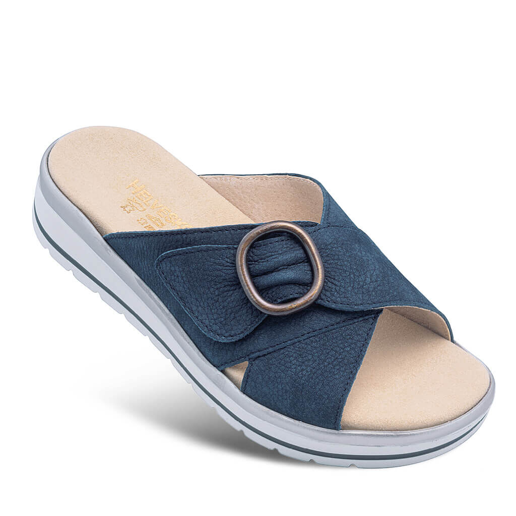 Pantofle pro ryzí relaxaci na boso s pásky na suchý zip pro individuální tvar. Pod elegantními zkříženými pásky z měkké usně s dekorativní sponou se ukrývá praktický suchý zip. S jemnou koženou podšívkou a vyměnitelnou stélkou z lehkého korku s měkkým potahem pro extra komfort na boso. Letní stylová podrážka měkce tlumí každý došlap, a tím chrání klouby a páteř.