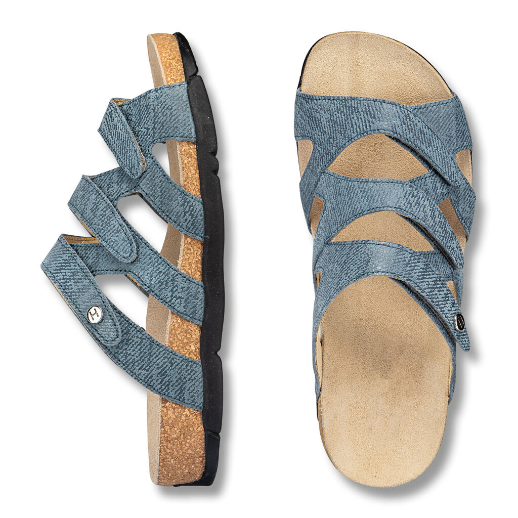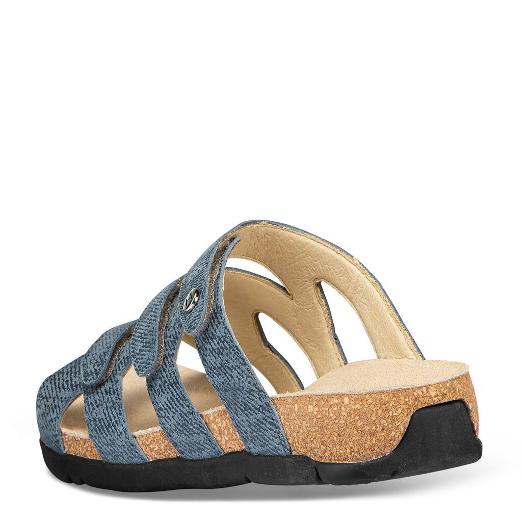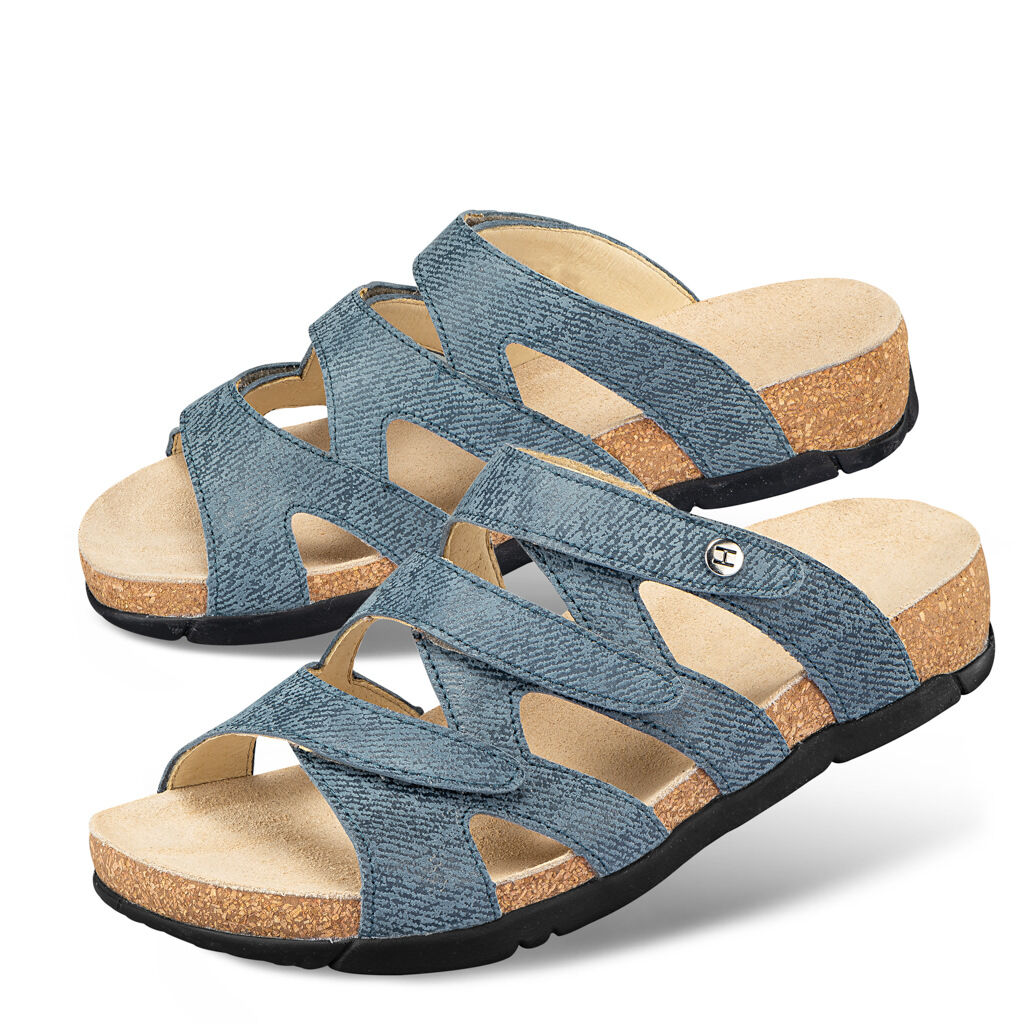 Atraktivní korkové pantofle, které padnou jako ulité! Tři pásky na suchý zip pro příjemnou stabilitu na chodidle. Půvabný mřížkový design nechá chodidla volně dýchat. Velurová kozí useň s módní ražbou, kompletně podšitá jemnou usní. Protiskluzová podrážka z lehkého korku.