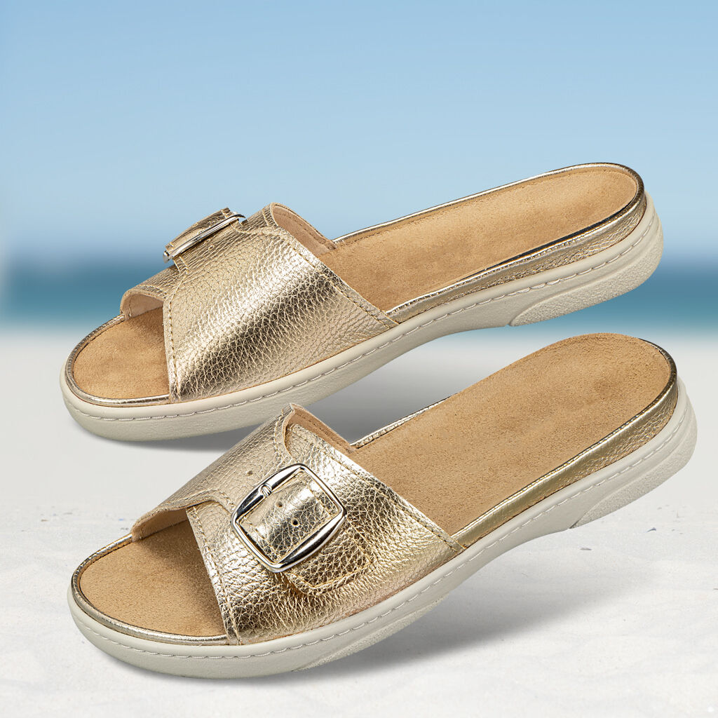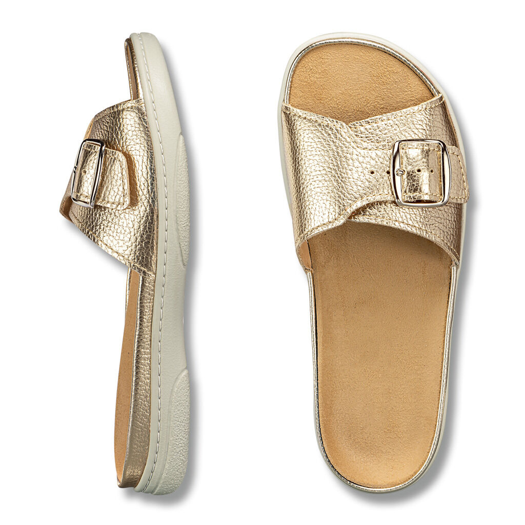 Pantofle na doma i na ven, s praktickou přezkou pro individuálně nastavitelný tvar, elastickou zónou a širokým lemováním. Stélka je zcela zapuštěná do podrážky. S jemnou koženou podšívkou. Lehká skořepinová podrážka s vyjímatelnou stélkou.