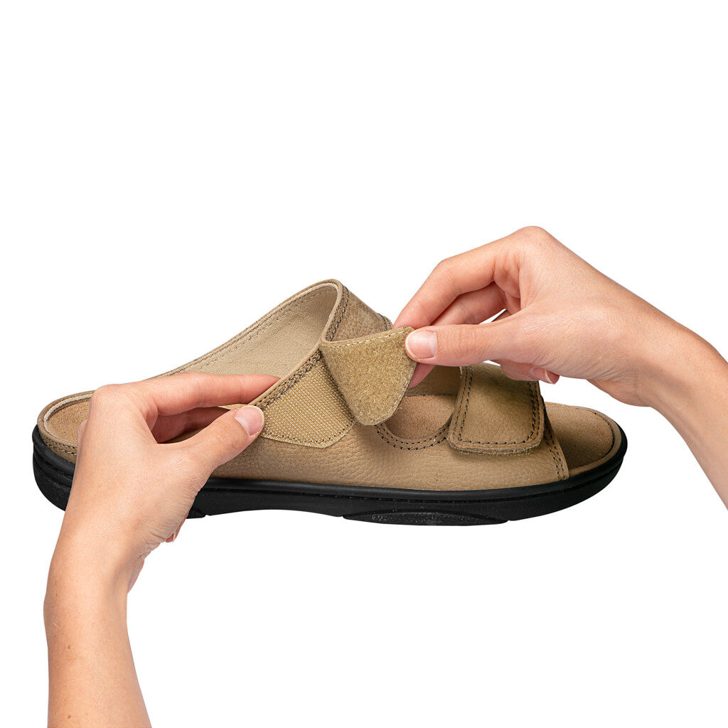 Úžasně lehké pantofle na skořepinové podrážce se vzduchovými polštářky pro uvolněnou chůzi. Optimální tvar a flexibilní stabilita na chodidle díky měkkým páskům na suchý zip. Sametová hovězí useň s podšívkou z jemné kozinky. Vyměnitelná relaxační stélka.
