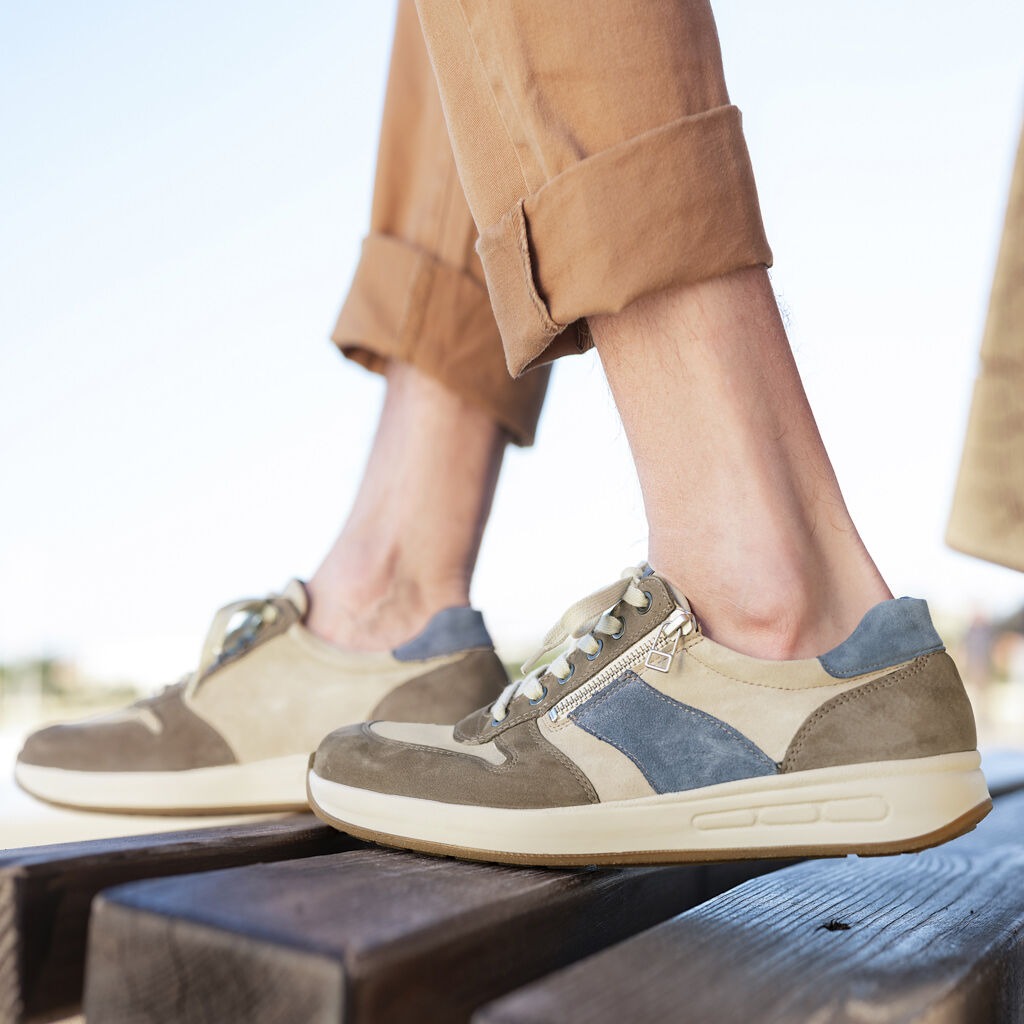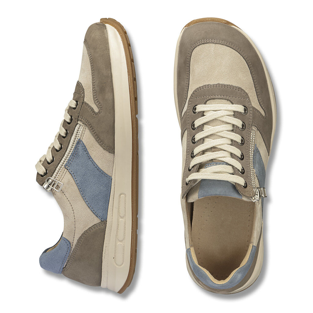 Velkorysé tenisky v kombinaci měkké nubukové a velurové usně s bohatě polstrovaným lemem a jazykem. S podšívkou z prodyšného mikrovlákna. Praktické šněrování a zip pro pohodlné nazouvání. Vzduchem odpružená podrážka SoftMove s elastickou tlumicí vrstvou pro ideální úlevu páteři a kloubům. Vyjímatelná stélka z přírodního korku.